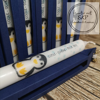 Nachdem die bestempelten Pinguin-Kerzen so gut angekommen sind, habe ich gleich noch ein paar Stabkerzen gestaltet, die ich an Freundinnen und Müttern aus meiner EKP Gruppe verteile.